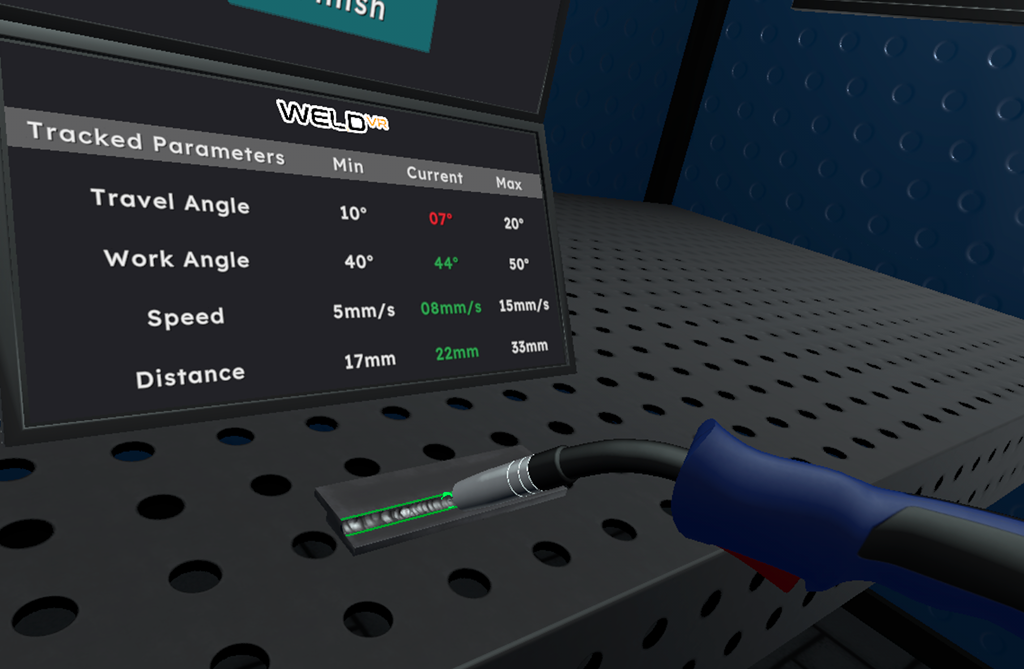 WeldVR features a sophisticated grading and scoring system based on the real-time tracking of user performance in terms of speed, angle and distance. The system records the movements of the user for further analysis.
